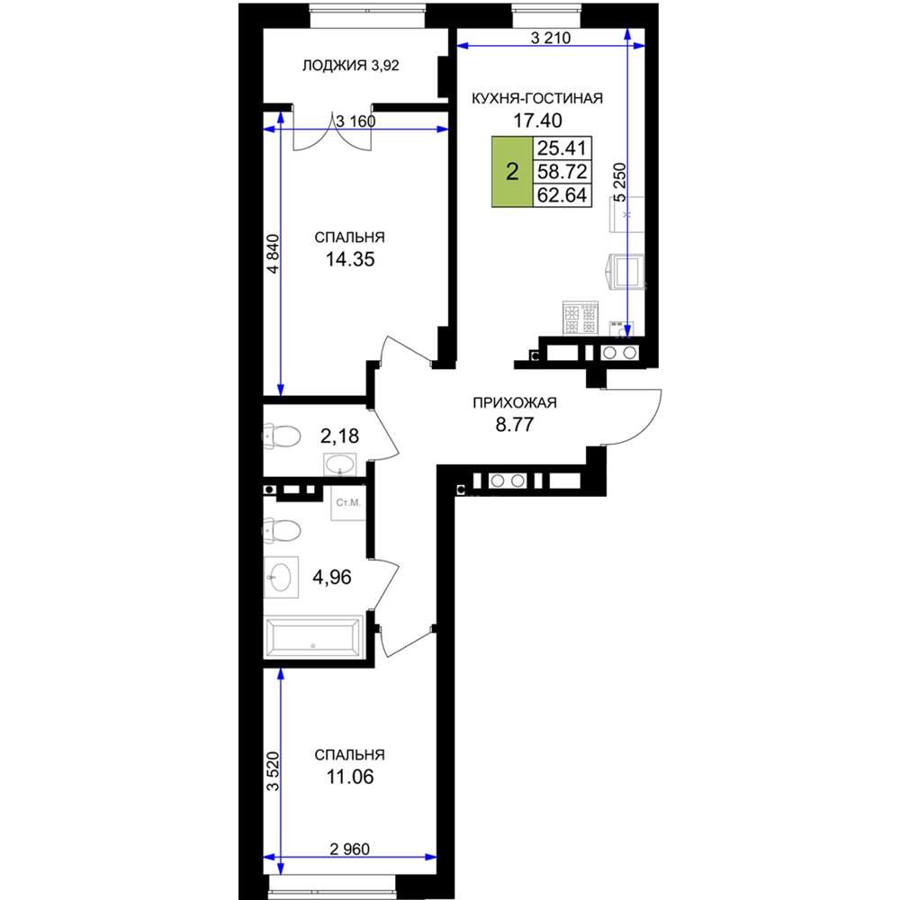 общая 62,64 м2, жилая 25,41 м2, кухни 17,4 м2 |